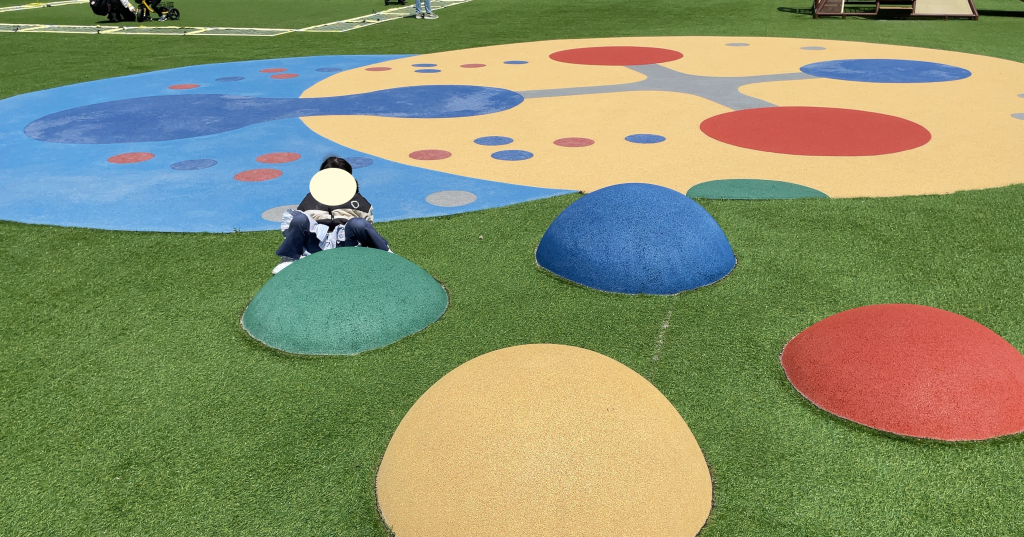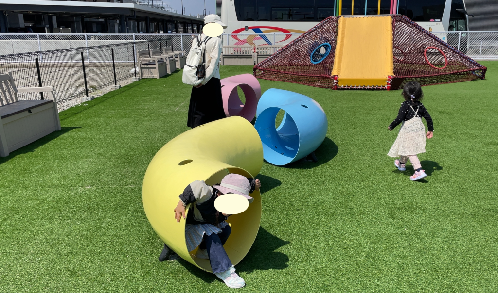 その他には、ポップカラーのトンネル型の遊具や小さな小山がありました。全体的にポップなカラーが利用されていて明るい雰囲気の公園です。芝生も人工芝なのでポップカラーと合わさって、「子供の公園」という感じです。