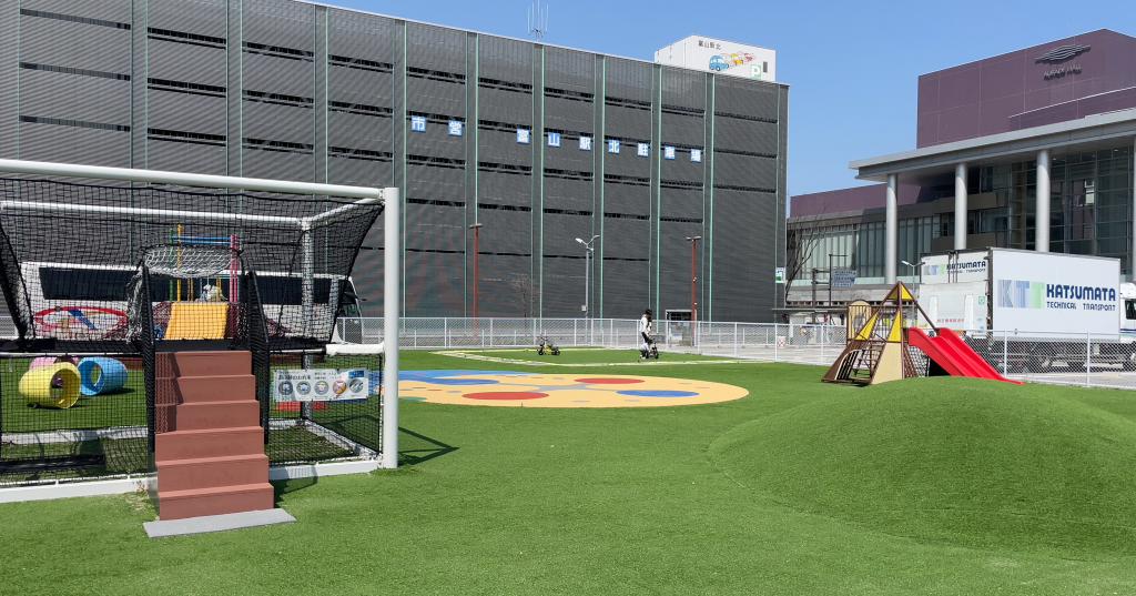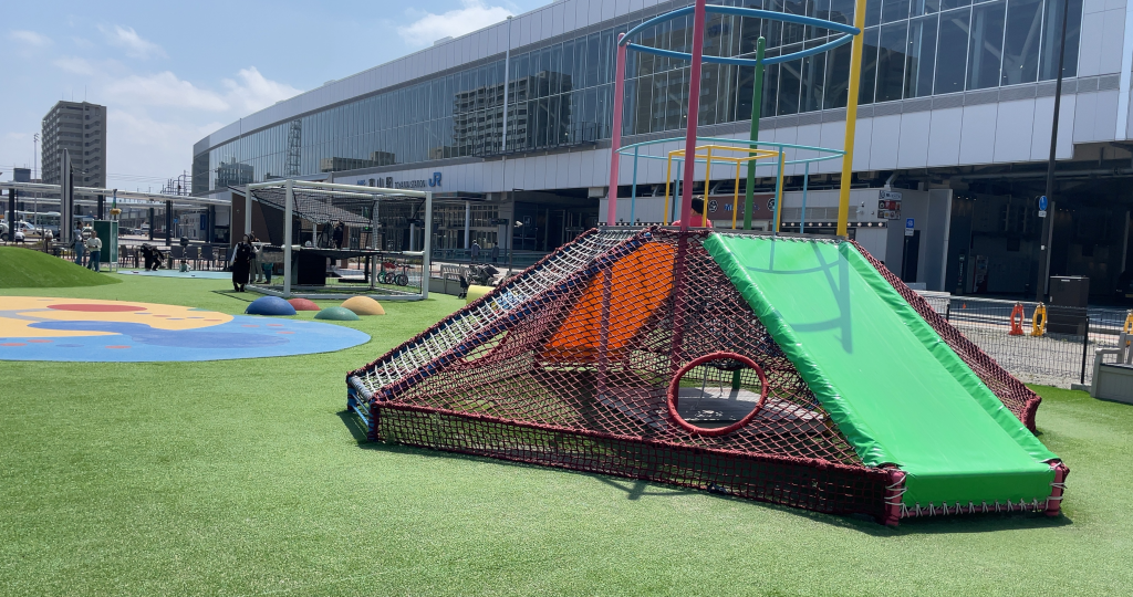 富山駅周辺は商業施設ばかりで子供が体を動かして遊ぶところが少ないので、このような公園があると親としては富山駅周辺に来たときに子供を楽しませることができるので良いコンセプトの施設だと感じました。また、ごっこぱーく周辺には、八番ラーメンやはなまるうどんなど、子供と行きやすい飲食店が充実しているので、食事の心配もないのがいいですね。