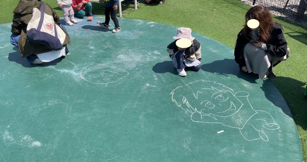 「ごっこぱーく」には、普通の公園にはない大きな黒板があります。チョークも用意されていて、子供たちと普段はできない地面に絵を描いて遊ぶことができます。注意点としては、ここで遊んだ後はチョークの粉まみれになるので、服が汚れる覚悟が必要です。