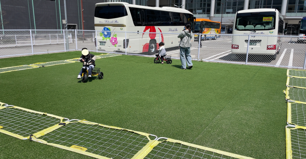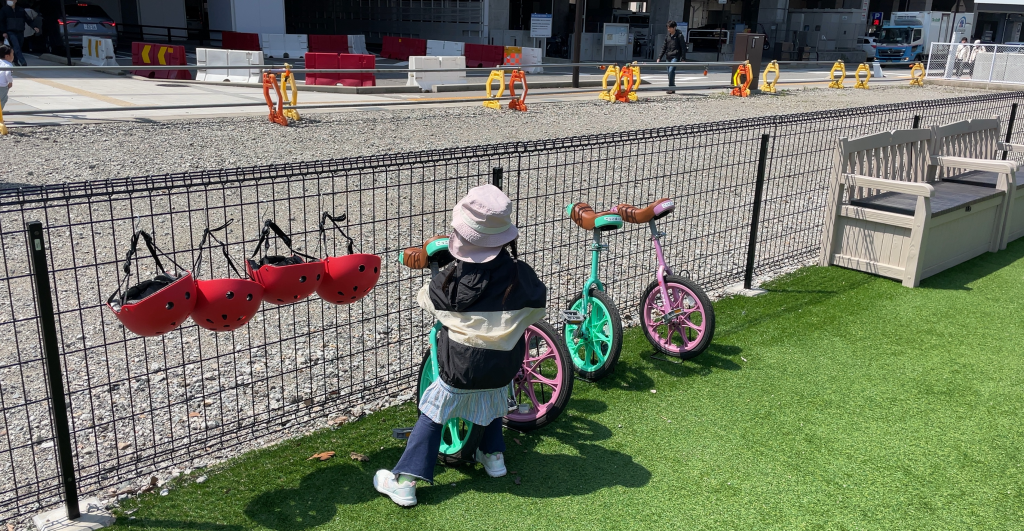また、一輪車も用意されています。こちらも公園で遊ぼうとすると、車に積んだり準備が必要なので、手軽に利用できるのが「ごっこぱーく」の良いところだと思いました。