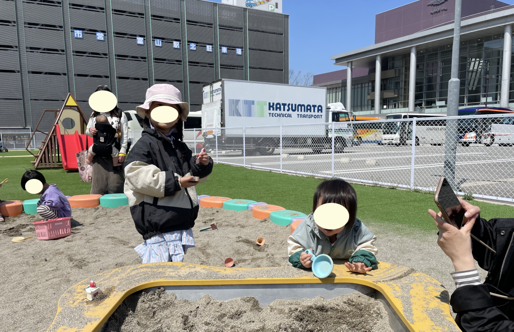 砂遊びセットがおいてあり、手ぶらで砂場遊びができるが良いポイントですが、わたしが行った時は砂遊びセットが1セットしかありませんでした。そのため、人が使っていると砂場遊びが楽しめないので、せめて3セットくらい用意してほしいと感じました。