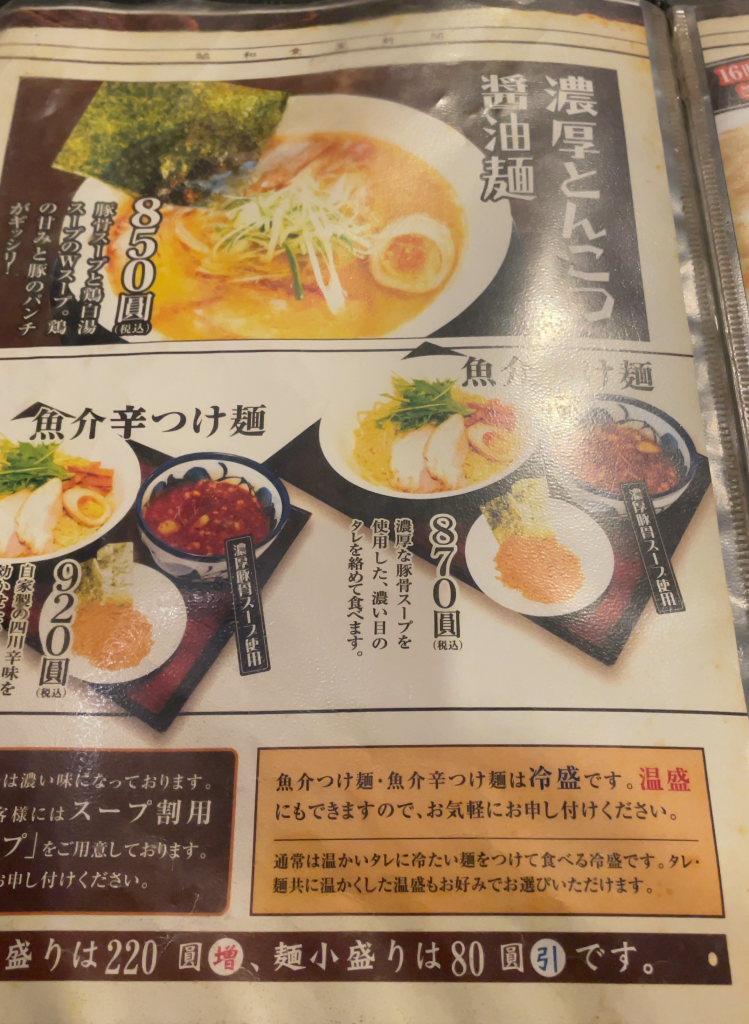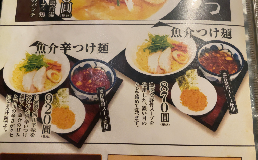 さらにさらに!つけ麺好きの方には、「魚介つけ麺」、「魚介辛つけ麺」があり、ガッツリ味を楽しみたい方には「濃厚豚骨醤油ラーメン」まであります!