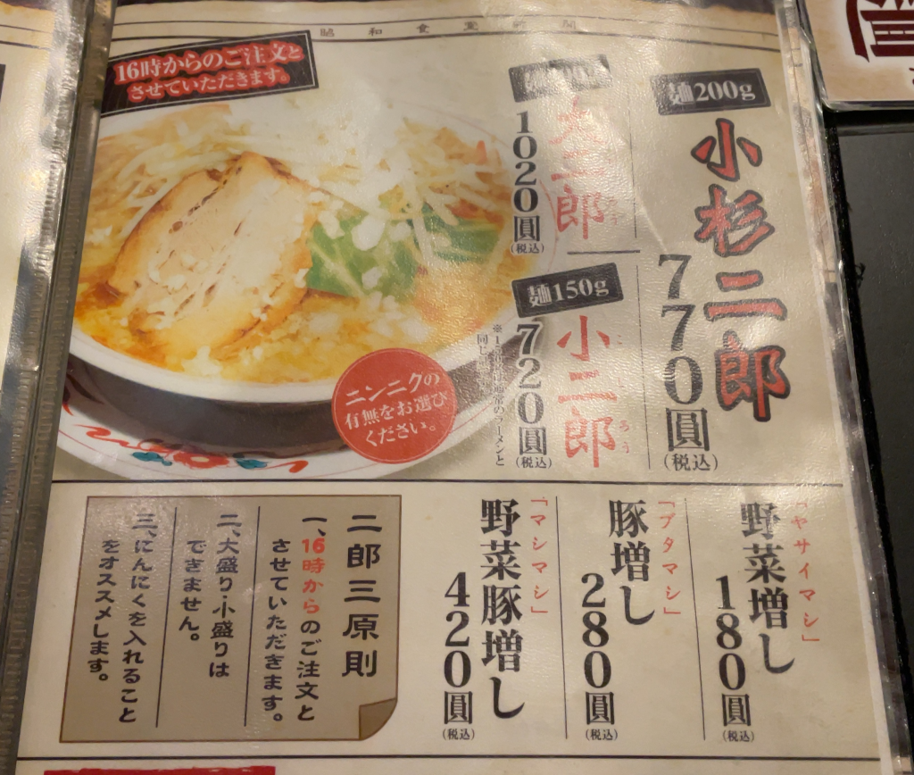 そんな方向けに「小二郎」という一般的な麺の量のメニューも提供されています。