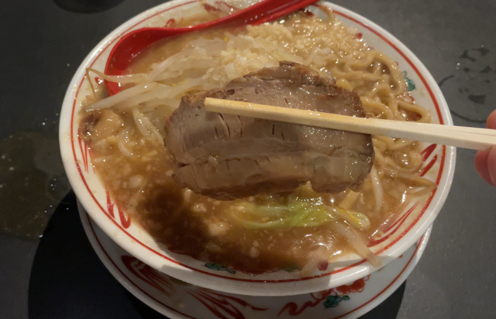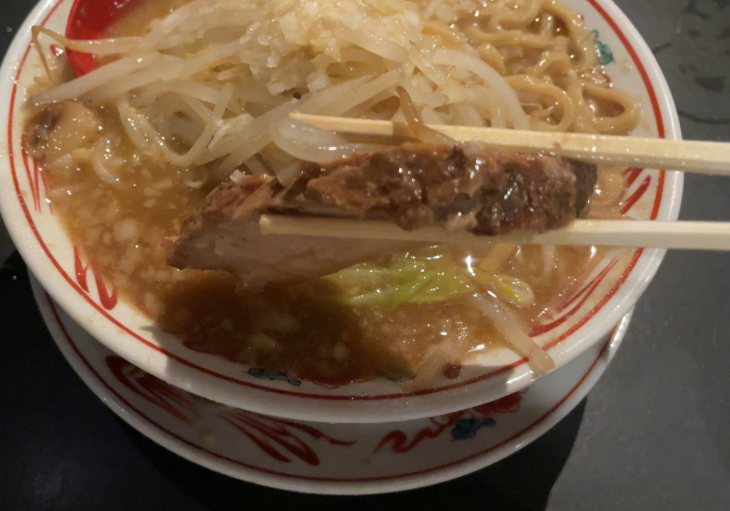 チャーシューの厚みはこんな感じ。二郎系のチャーシューとしてはちょっと薄い気がしますが、値段を考えるといいんじゃないでしょうか。一口食べてみると・・・うまい!