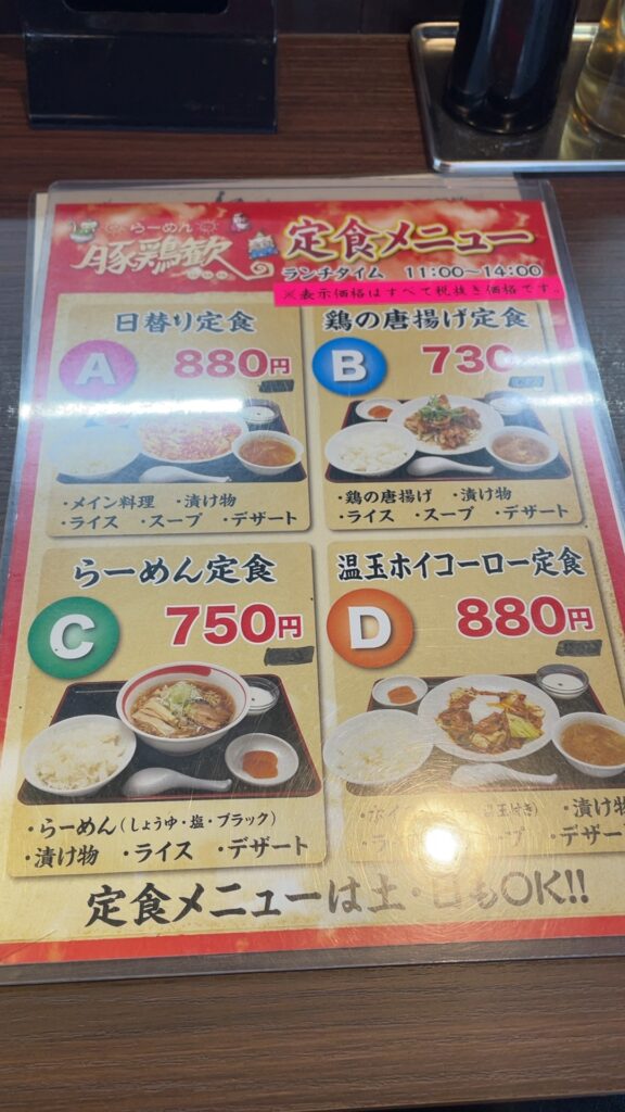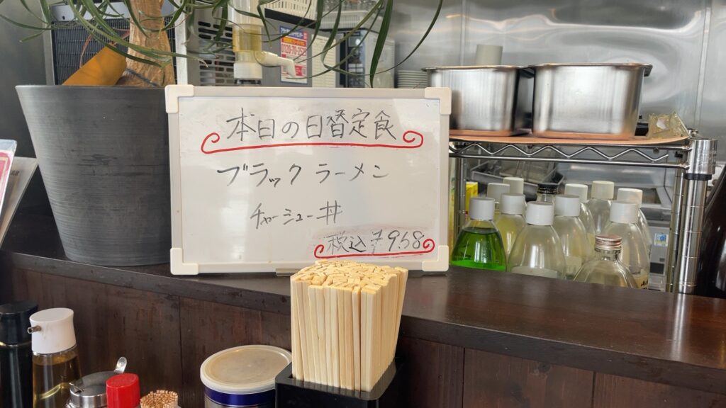 私が来店した日の日替わり定食は、ブラックラーメンとチャーシュー丼。個人的にゴールデンコンビです。しかもお値段は税込968円と安い!