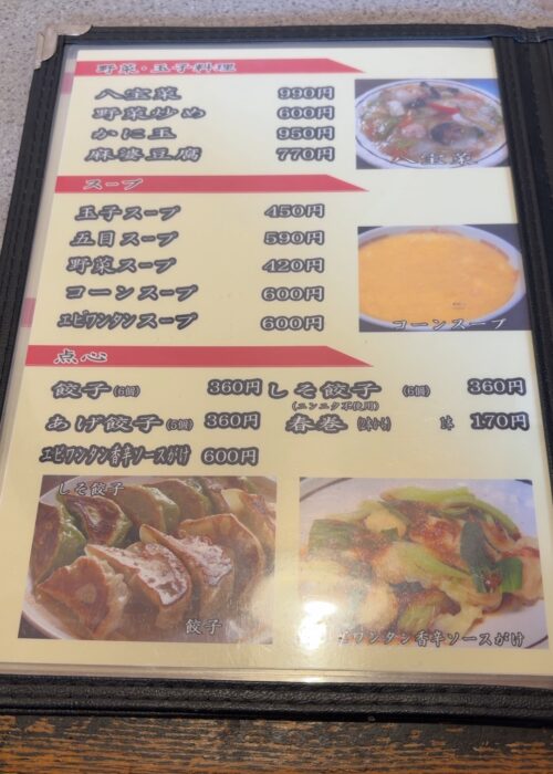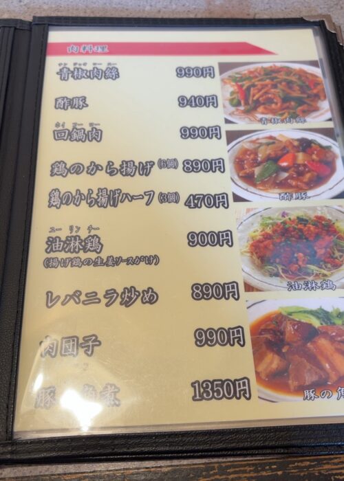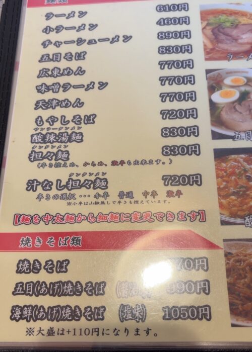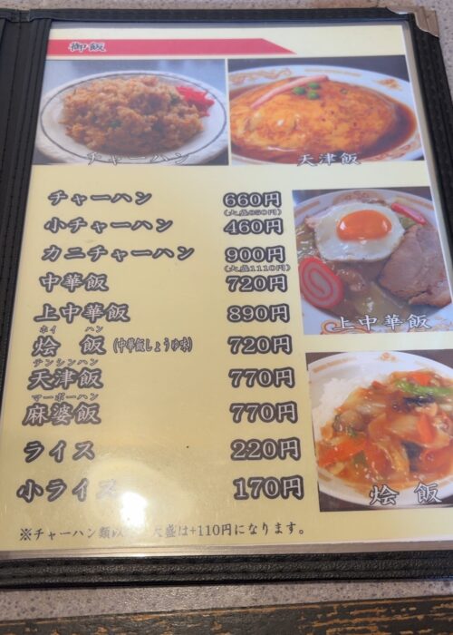 菜香さんのメニューはこんな感じ。町中華らしくラーメンやチャーハン、天津飯や八宝菜など多彩なラインナップです。しかも値段が安い!