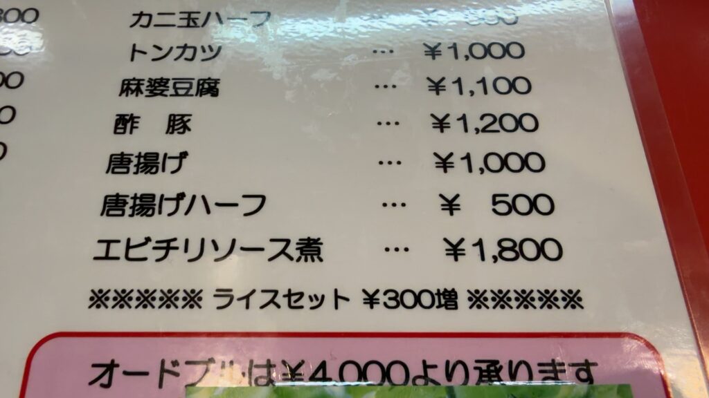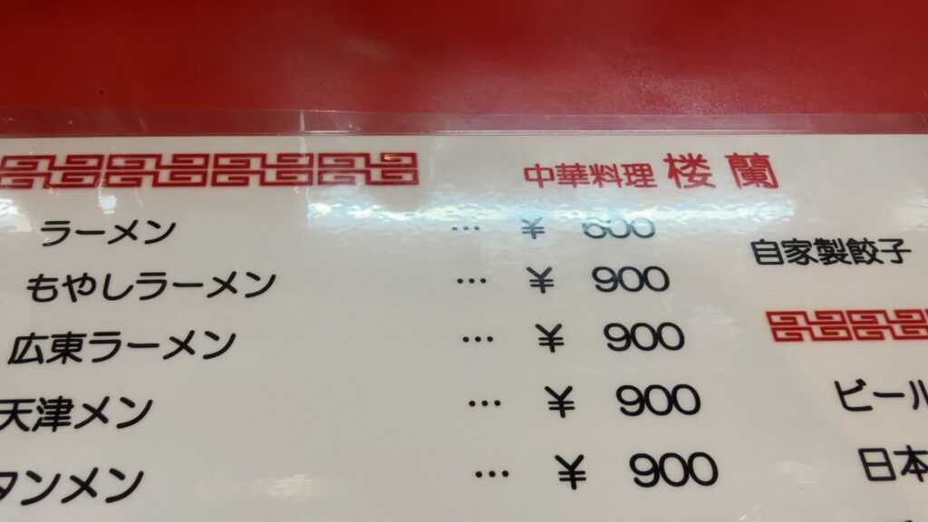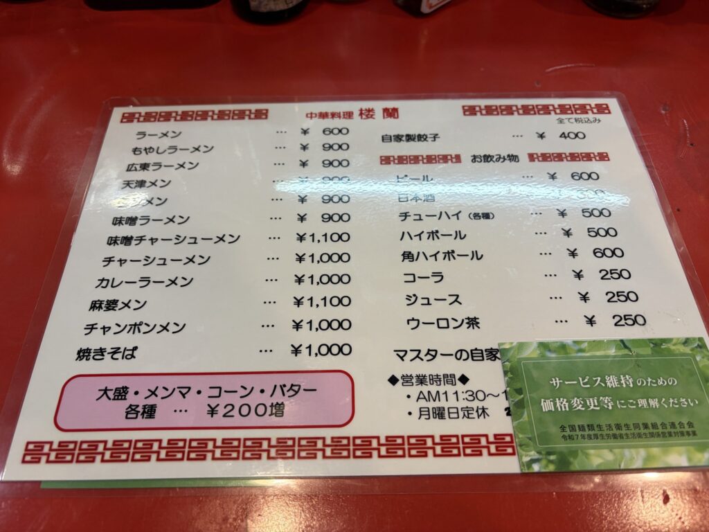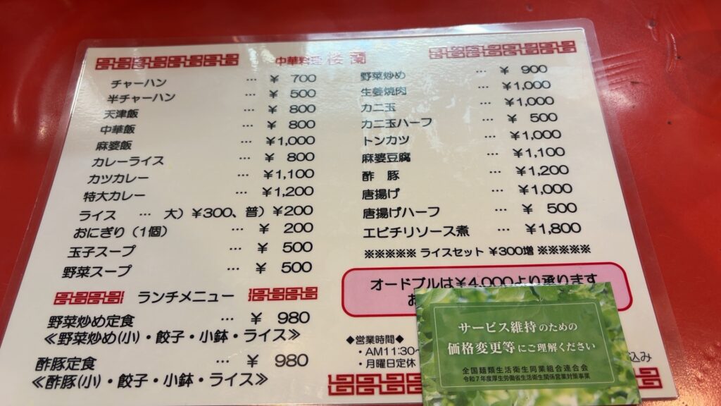 楼蘭さんのメニューは、中華食堂らしく、ラーメンからチャーハン、唐揚げやエビチリなどがあります。
