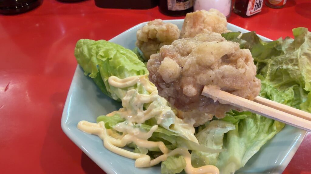 ラーメンの先に唐揚げハーフが到着。ハーフといいながらも唐揚げが5つ入ってるので嬉しい。