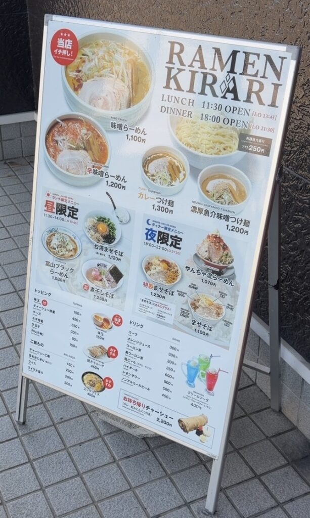 キラリさんは、つけめんやブラックラーメン、二郎系らーめんなど、いろいろな種類のラーメンを提供していますが、これらは「昼限定」「夜限定」のラーメンになっています。