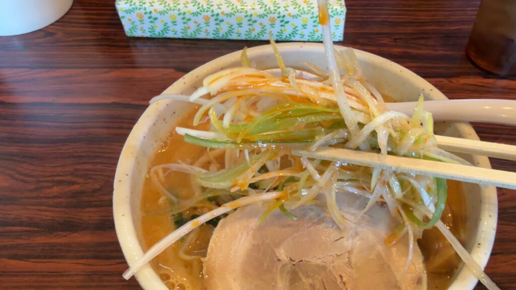 もやしと白髪ネギ、そして麺を一緒に食べると口の中に幸せが広がります。