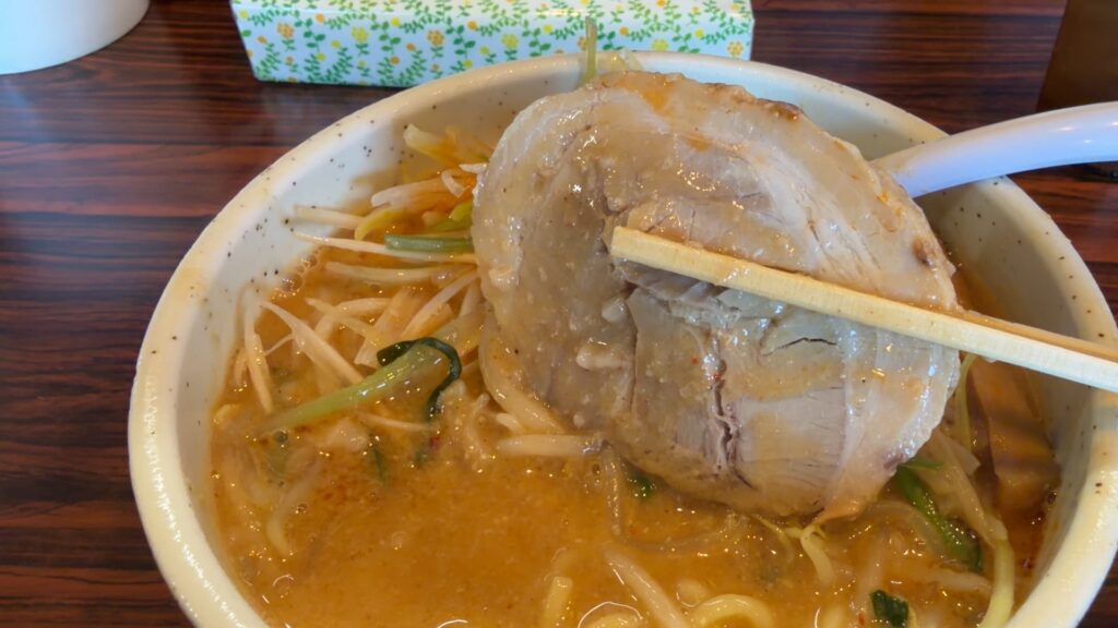 大きいだけじゃなくて厚さもあるチャーシューです。食べてみるとほろほろ柔らか。濃い目の味ではなく、ちょうど良い味で味噌ラーメン全体の邪魔をしない味付けです。