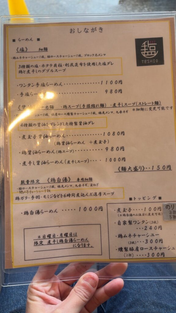 看板メニューは、店名がついた塩ラーメンにワンタンが入った「ワンタン手塩らーめん」。