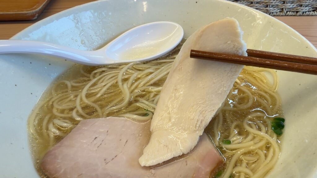 チャーシューは2枚。部位の違う2種類の鶏チャーシューがあります。
