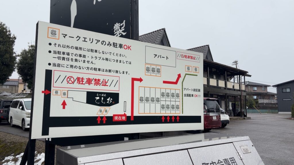 てしおさんの駐車場は、お店の前と横の他に、隣のアパートの駐車場に停めることができます。
