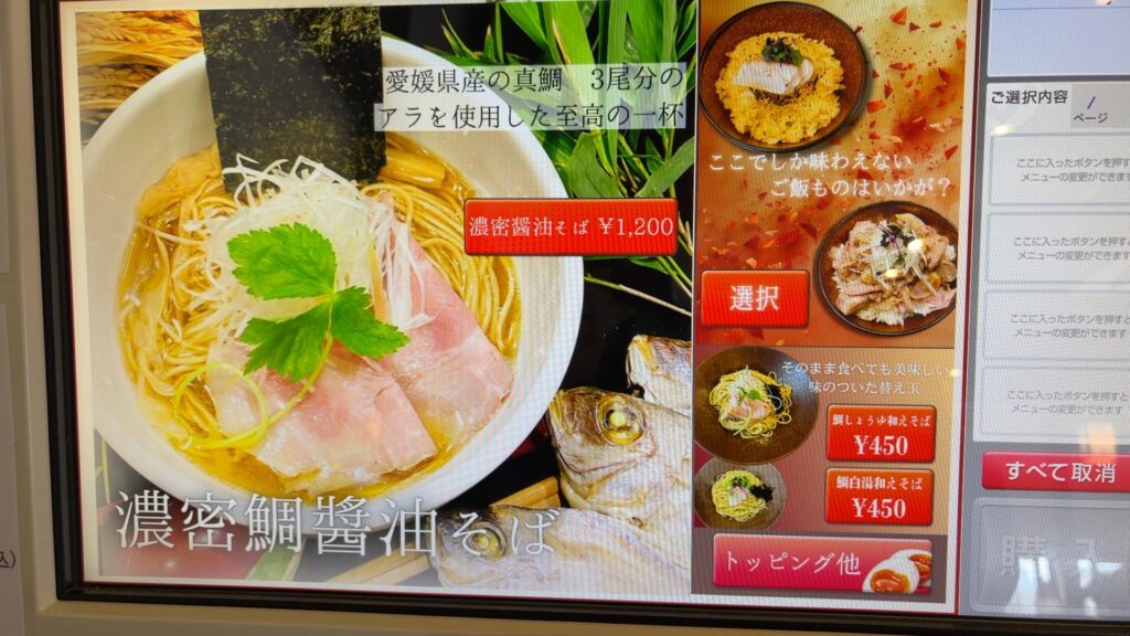 看板メニューは鯛白湯そばなのですが、ワタクシちょっと白湯系のラーメンがそんなに好きじゃなく・・・今回は、鯛醤油そばを注文しました。