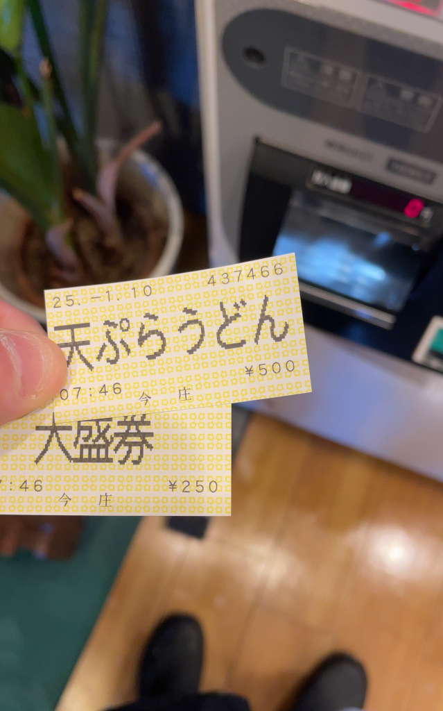 わたしは、天ぷらうどん(500円)と大盛券(250円)を購入。