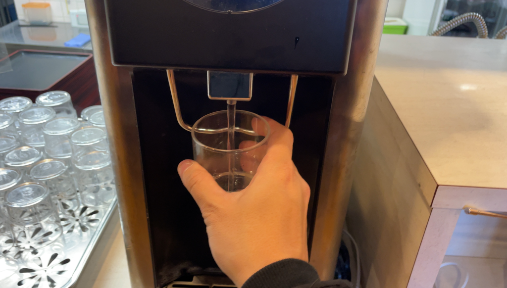 水はセルフ。ウォーターサーバから注いで、食事が出来上がるのを待ちます。