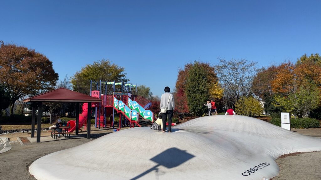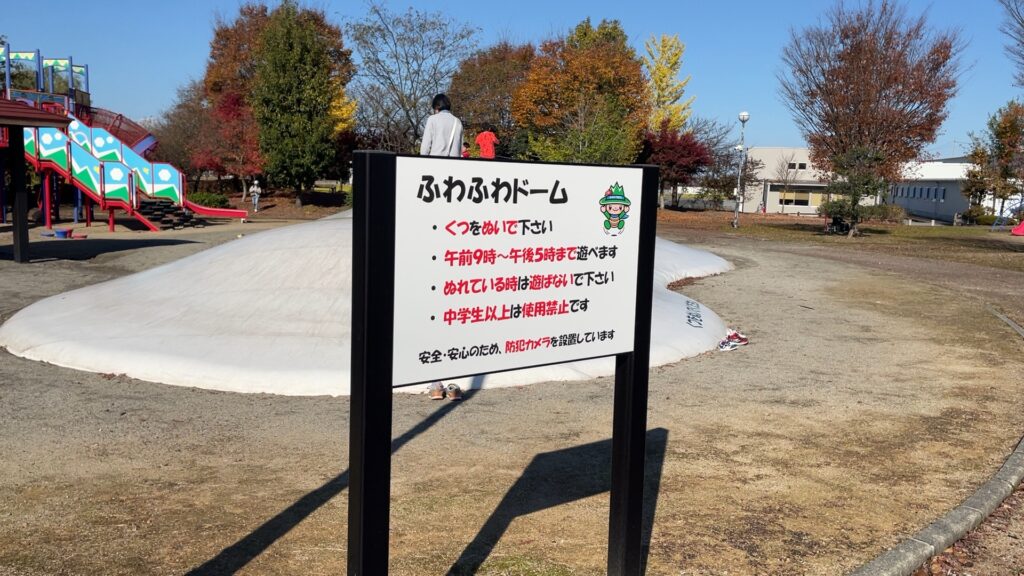 私の勝手な印象ですが、「ふわふわドーム」は町中の大きめの公園にしかないイメージ。そのため、上市町の自然な豊かなあさひの郷公園にあるのは意外でした。「自然の中の公園」と「ふわふわドーム」のギャップが好印象です。
