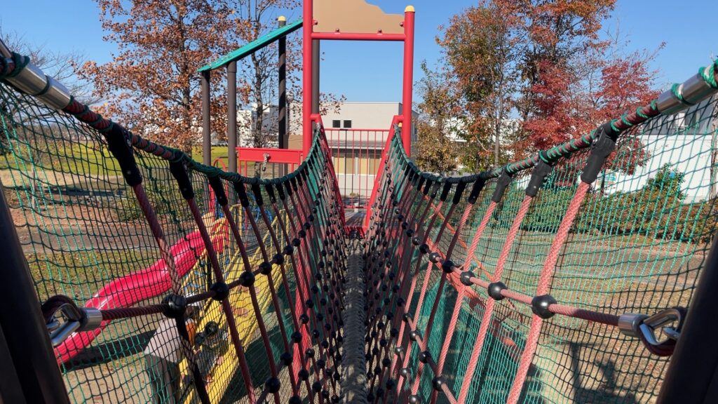 縄でできた通路もあり、通ると揺れて子供達にとっては程よいスリルを味わえる作りとなっていました。
