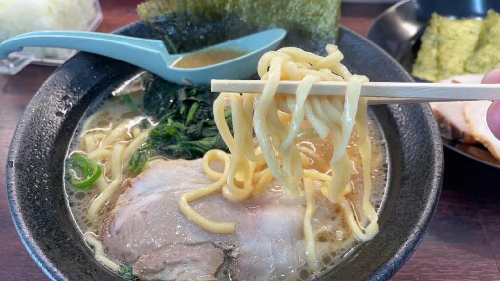 麺はこんな感じ。短めの麺で、こちらも家系ラーメンのスタンダードといった感じです。