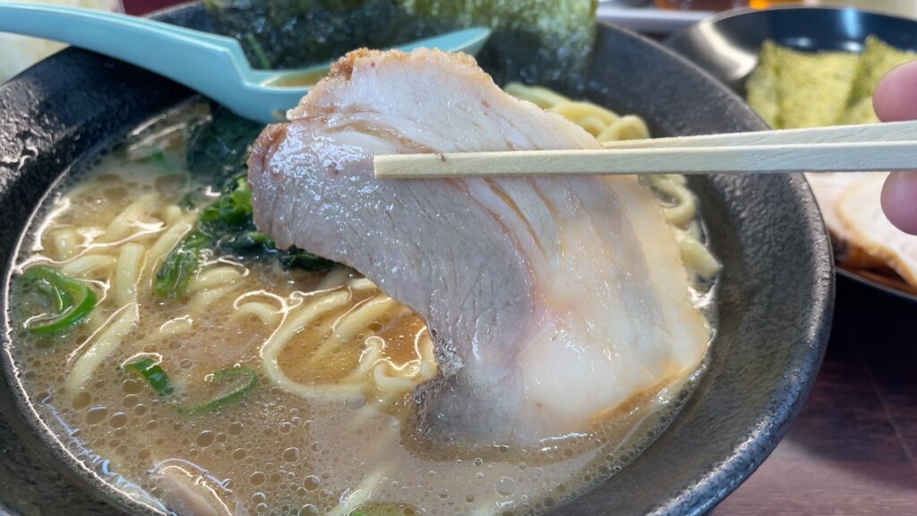 白濁したスープ、大きなチャーシュー、ほうれん草、海苔が入っており、見た目は家系らーめんそのものです。