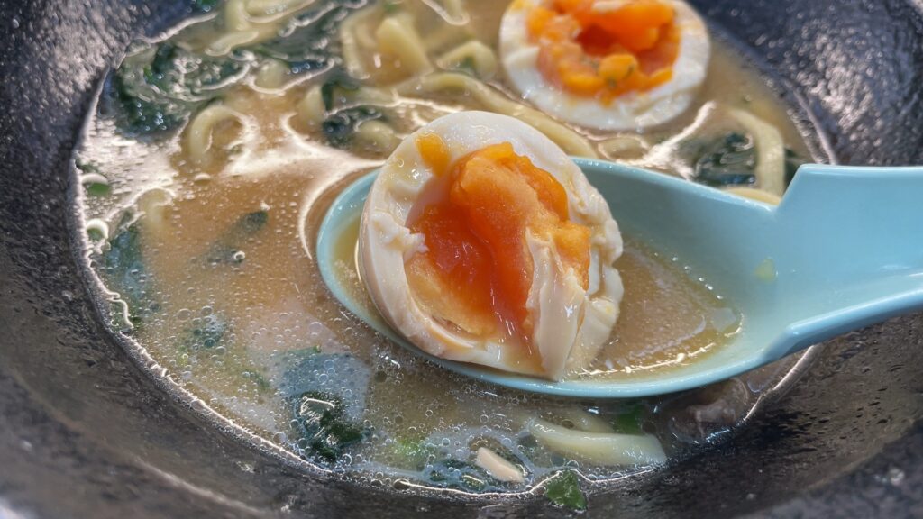 煮卵を割ってみるとこんな感じの半熟具合でした。