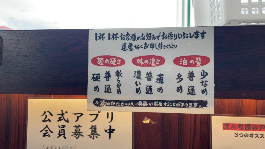 家系ラーメンでは定番の、麺の硬さや味の濃さ、油の量自分の好みに変更することができます。