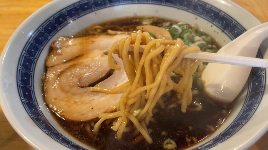 ブラックラーメンのスープを程よく絡んでくる麺で、スープと麺の味が口の中に広がります。