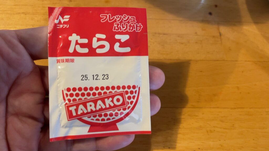 私は、たらこのふりかけをチョイス、ライスにかけます。