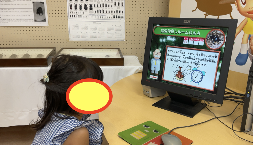展示コーナーには、それぞれの昆虫の特徴や生息地などが分かりやすく解説されており、学びの要素もたっぷり。昆虫の名前や特徴をクイズ形式で学べるコーナーもありましたが、3歳くらいの小さなお子さんには少し難しいかもしれません。我が家の子供も、最初は興味津々でしたが、すぐに飽きてました(笑)。