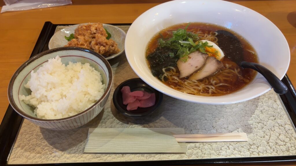 ラーメンと、唐揚げが三つ、ごはんと漬物がついたお得なメニュー。なんと980円です。