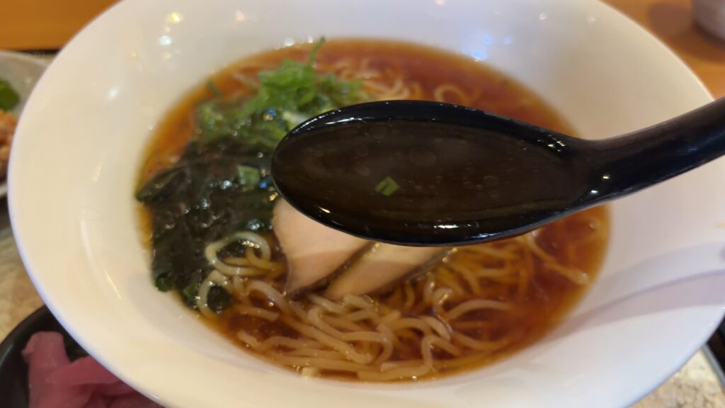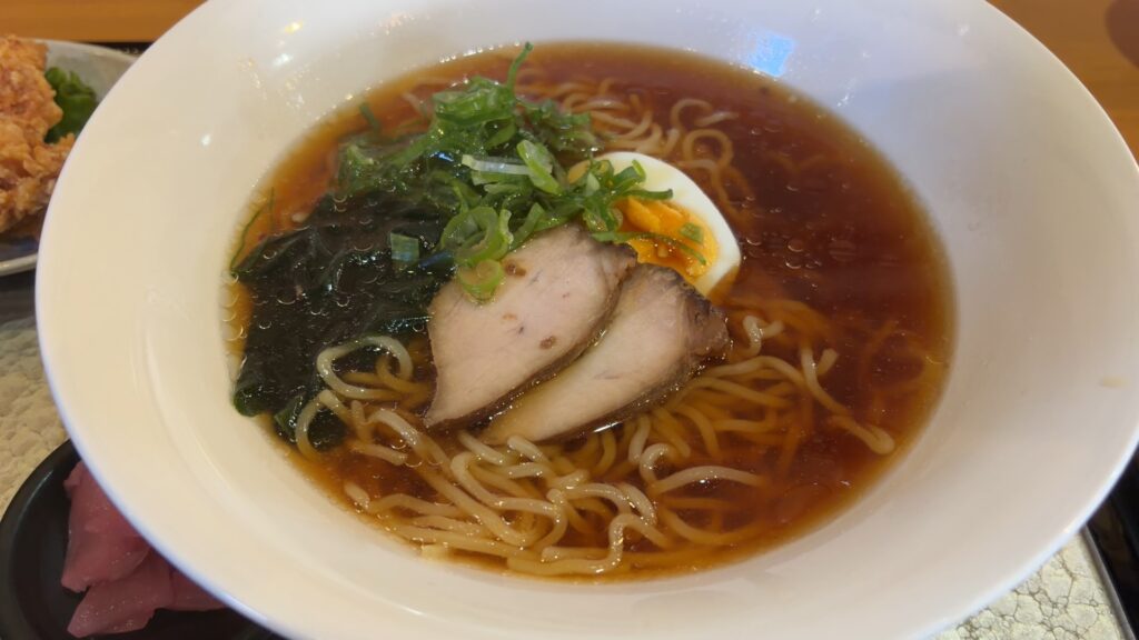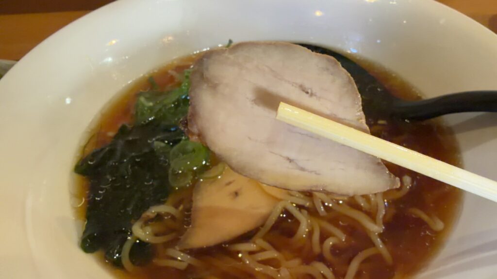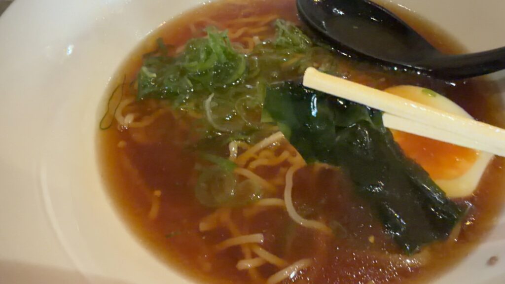 スープが透き通った醤油ラーメンです。具はわかめとチャーシュー、卵とちょっとのねぎ。まるで、高級中華店で出てくるようなラーメンです。