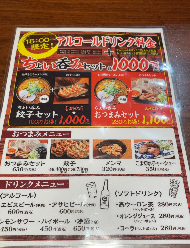 「ちょい呑みセット」は、好きなラーメン(半ラーメン)+おつまみセット、アルコール(別料金)を注文することでお得に食事できるセットです。
