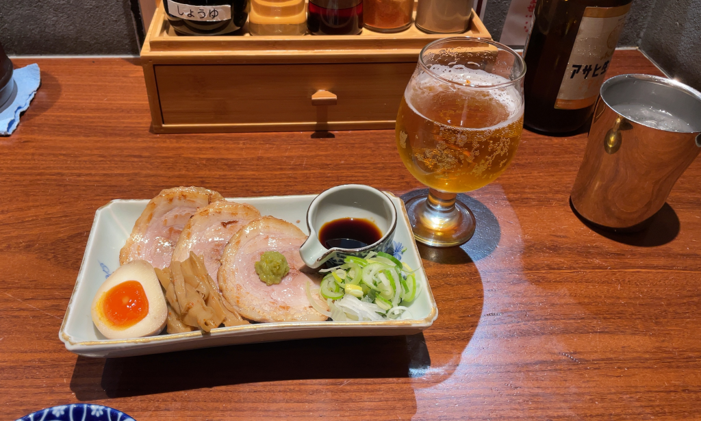 ビールで喉を潤してると、すぐにおつまみが到着。おつまみは、チャーシューが3枚に煮たまご、メンマとネギがあります。