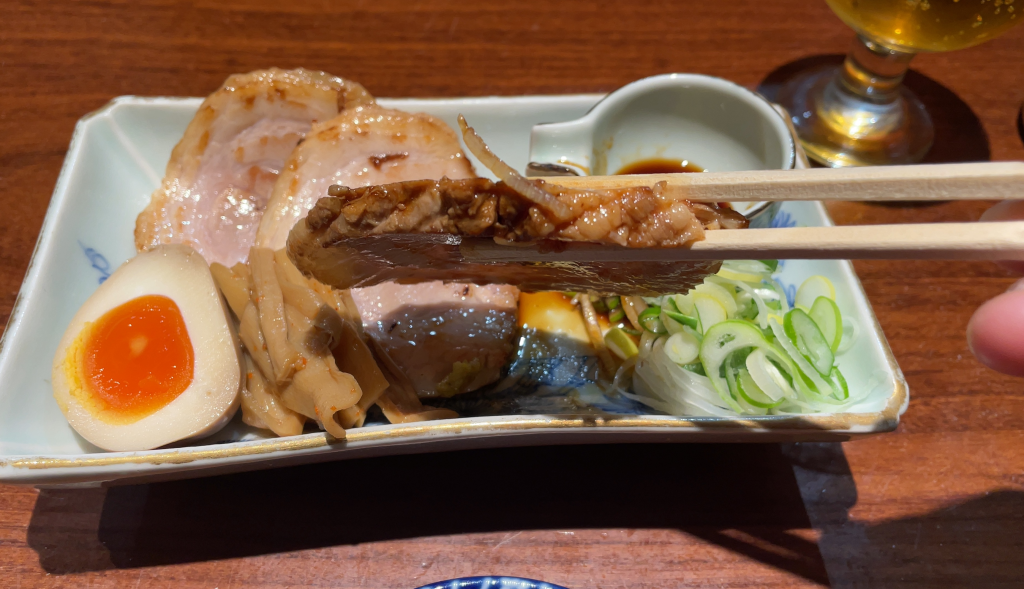 半ラーメンですが、しっかりチャーシューがのっているのがうれしい。ラーメンのチャーシューはおつまみのチャーシューとはまた違った味わい。「ちょい呑みセット」はチャーシューを二度味わえます。