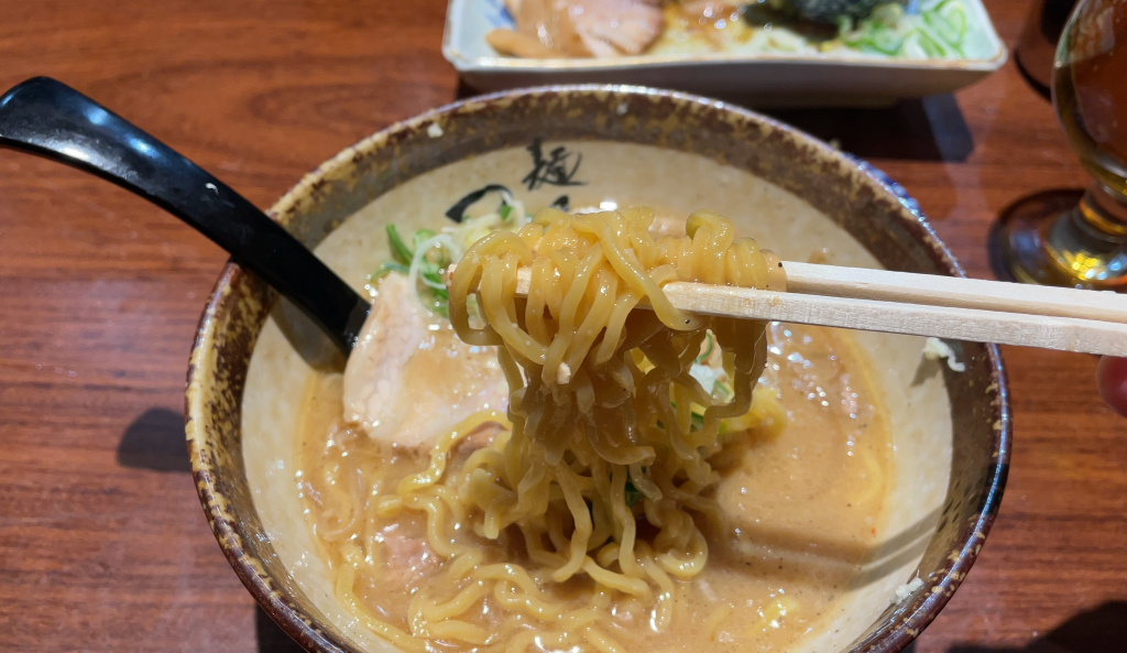麺は味噌ラーメンで定番のちじれ麺。スープがよく絡む麺です。