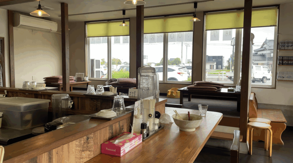 麺屋竜馬さんの店内は、広々としていて明るく、席の種類が豊富です。カウンター席、テーブル席、そして小さなお子さん連れにも優しい座敷席が完備されているため、様々なシチュエーションで利用できます。