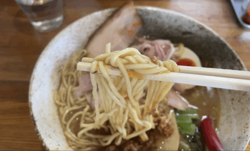 麺は、やや多めに感じられる量で、男性でも満足できるボリューム感です。もちもちとした食感で、このあっさりとした味噌スープがしっかりと絡みつきます。ただ、スープ単体で飲むと非常に美味しいのですが、麺と一緒に食べると、若干味が薄く感じる瞬間もありました。そんな時に活躍するのが、このあと紹介するあの具材です。