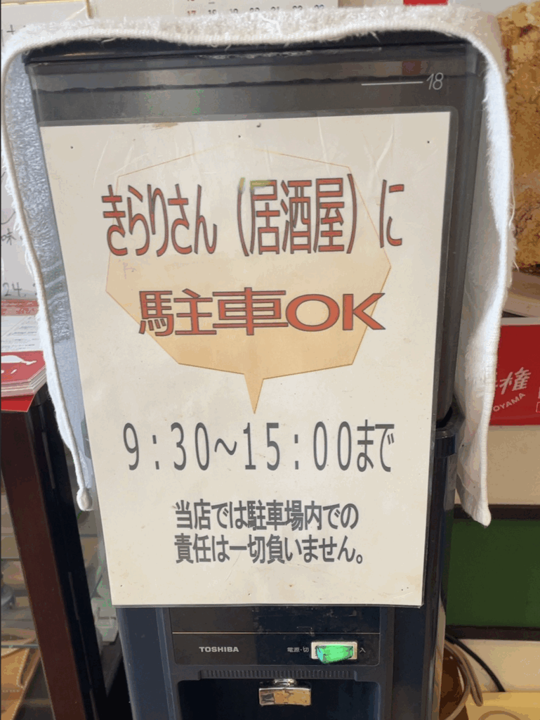 - 駐車場は狭いですが、朝と昼は居酒屋きらりさんに駐車OK