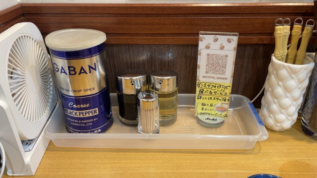 調味料自体は普通なのですが、各席ごとに扇風機が備え付けられてるのが特徴的です。
