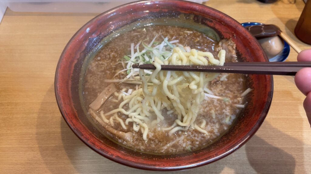 麺はこんな感じで、ちぢれ麺。スープとよく絡むタイプです。熱々のスープと絡んでハフハフ言いながら食べるラーメンです。熱々好きにはドストライク!