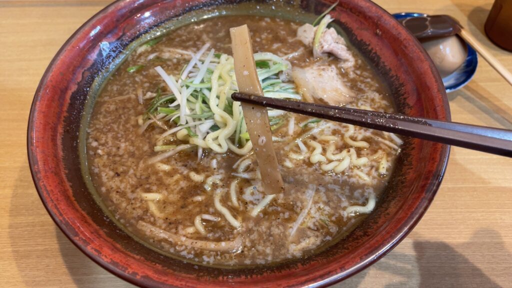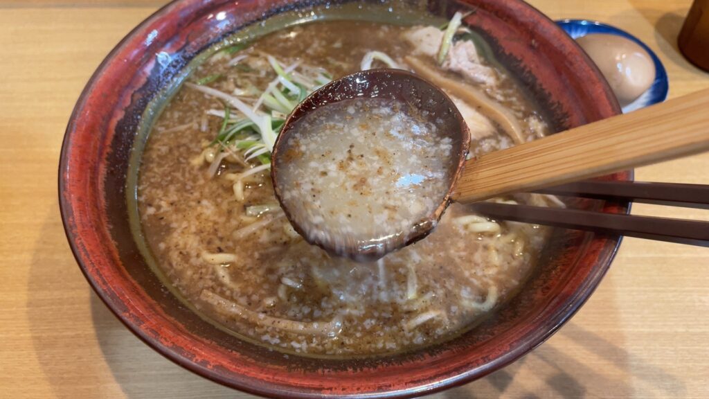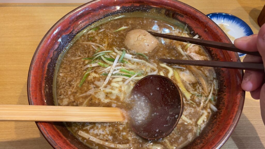 味は濃いめです。私はこの濃さが好きですが、薄味が好みの方は、店員さんに言うことで割スープをもらえるので味を調整することができます。