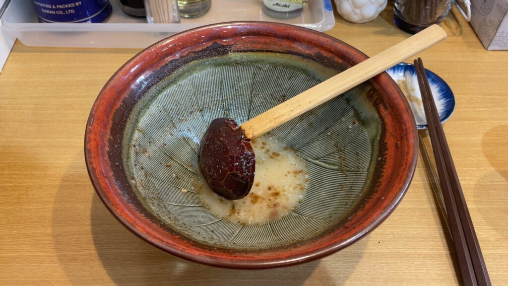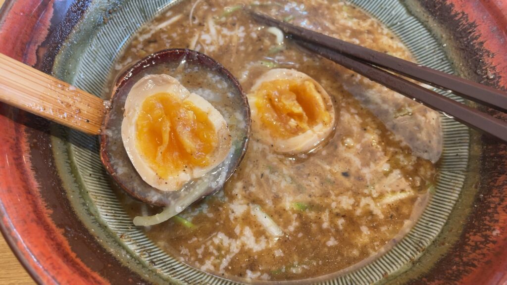 ちなみに味玉は、スープで温めておいて、中盤で食します。