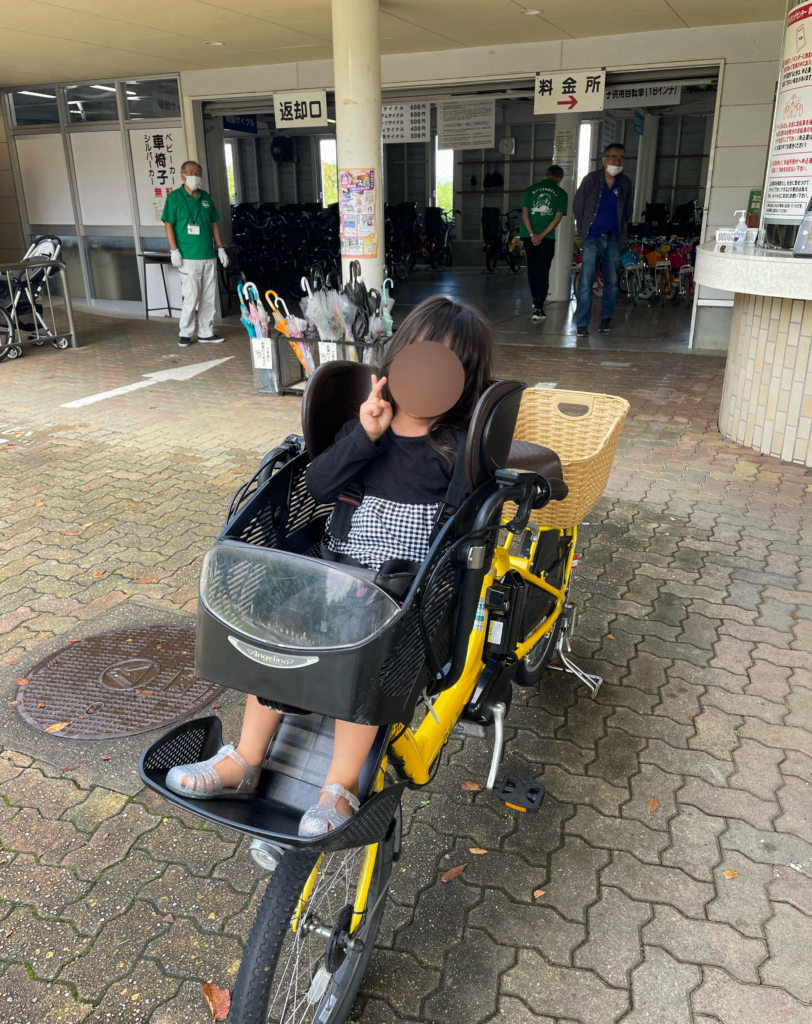 自転車は、太閤山ランド入り口のサイクリングセンターで借りれます。いろいろな自転車をレンタルできますが、わたしのオススメは子供と一緒に乗れる電動自転車。