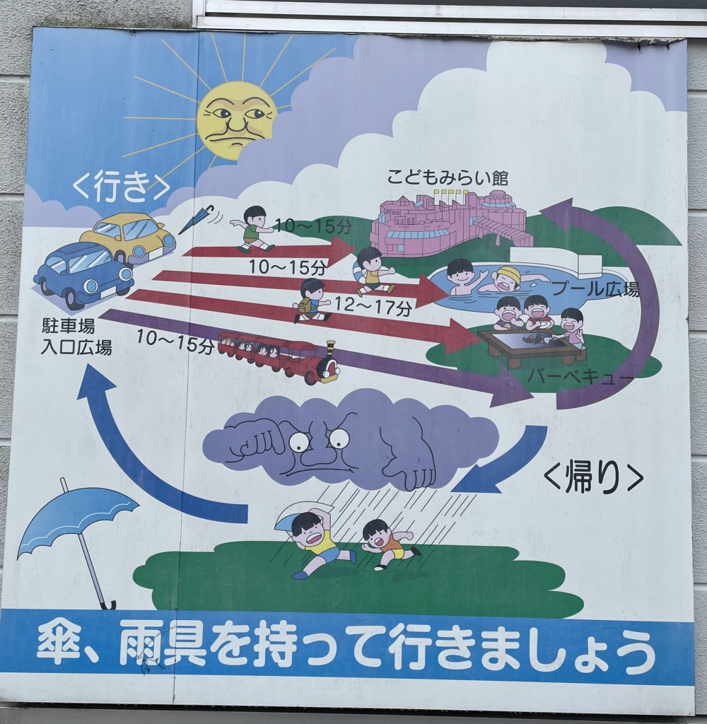 この看板のように園内はとても広いので、トレーンのような乗り物での移動がオススメです。