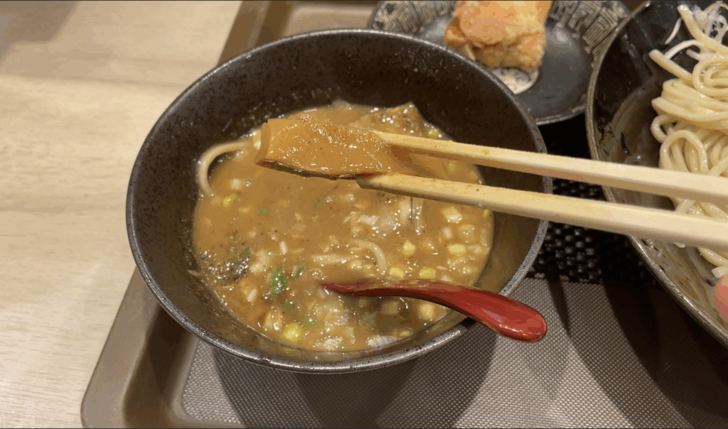 そして、チャーシューはしっかりとした肉質でありながら、硬すぎず柔らかすぎない絶妙なバランス。味付けもしっかりとしていて、つけ麺のスープに負けない存在感があります。
