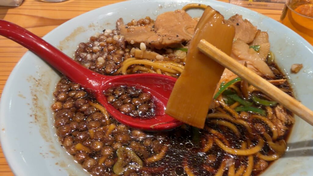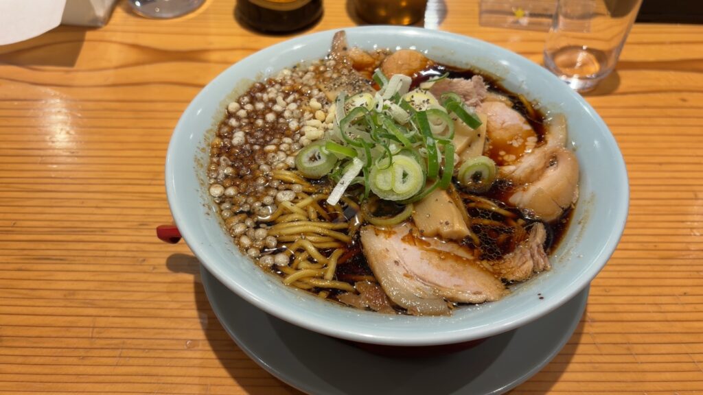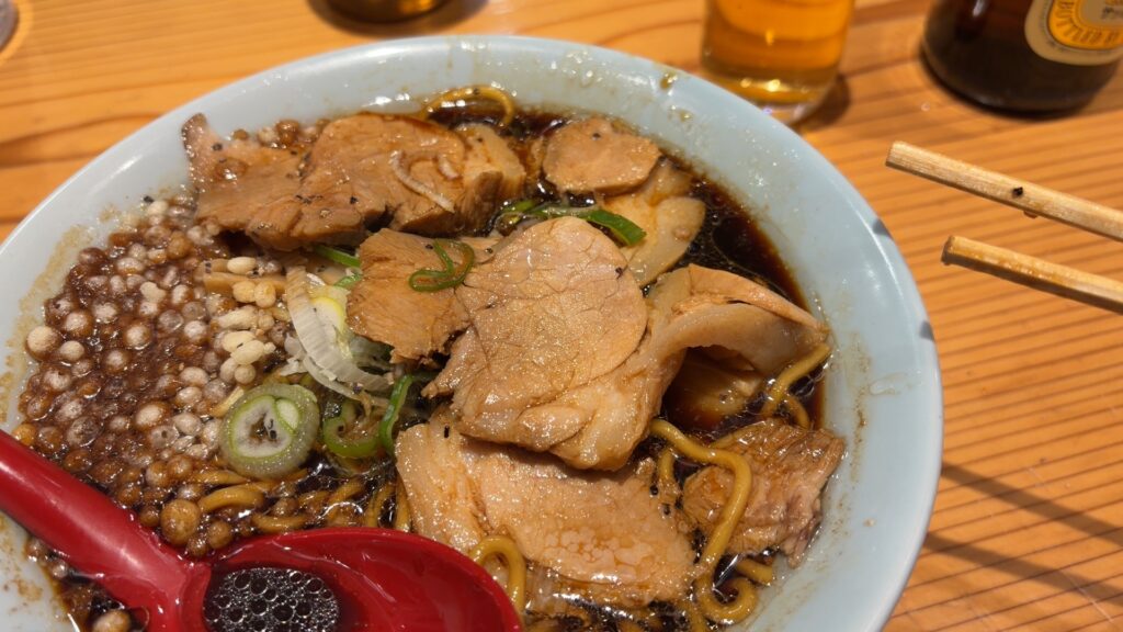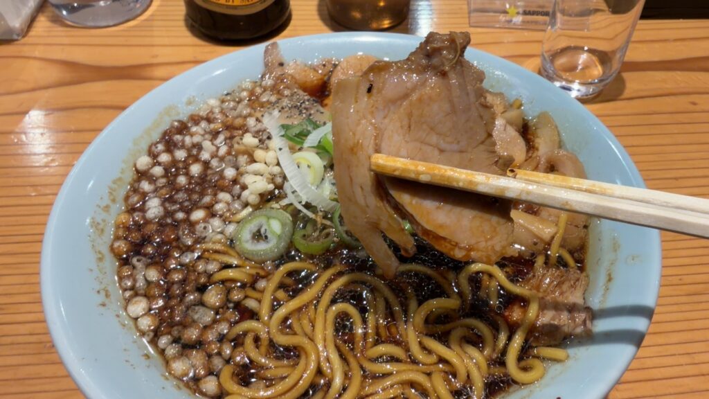 黒色のスープはもちろんインパクトがありますが、脂かすやチャーシューの量が多く、スープの色よりこちらのインパクトの方が強いです。