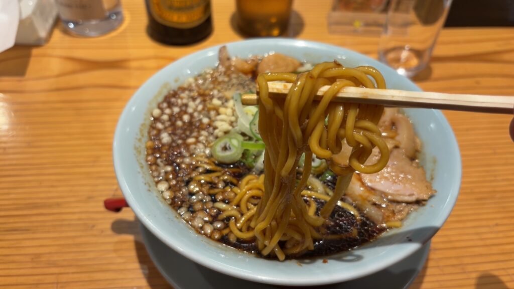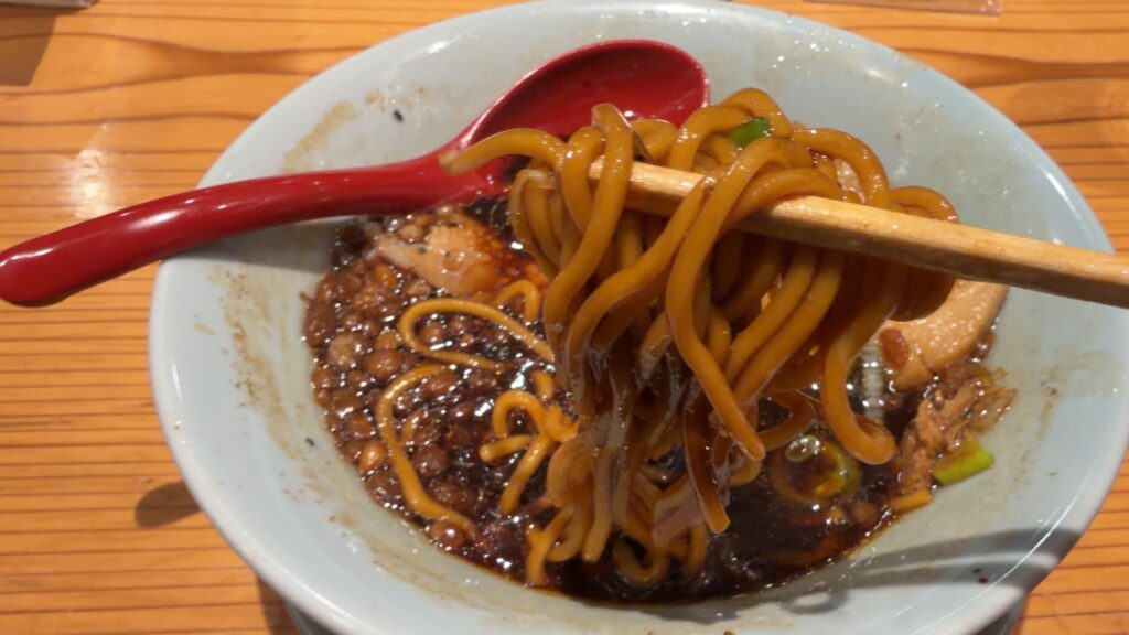 麺は黒色に染まっています。食べてみると、固さがちょうどいい麺で美味しい。