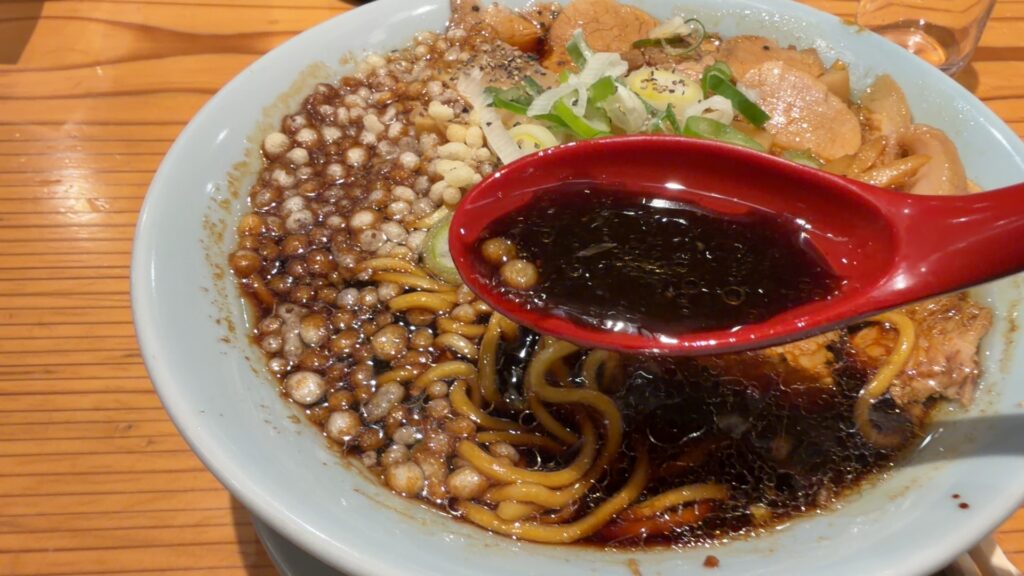 ガッツリえびすこさんの富山ブラックは、数種類の醤油タレを黄金比でブレンドしたものらしいです。黒胡椒も入っているらしく、パンチがあるスープとのこと。