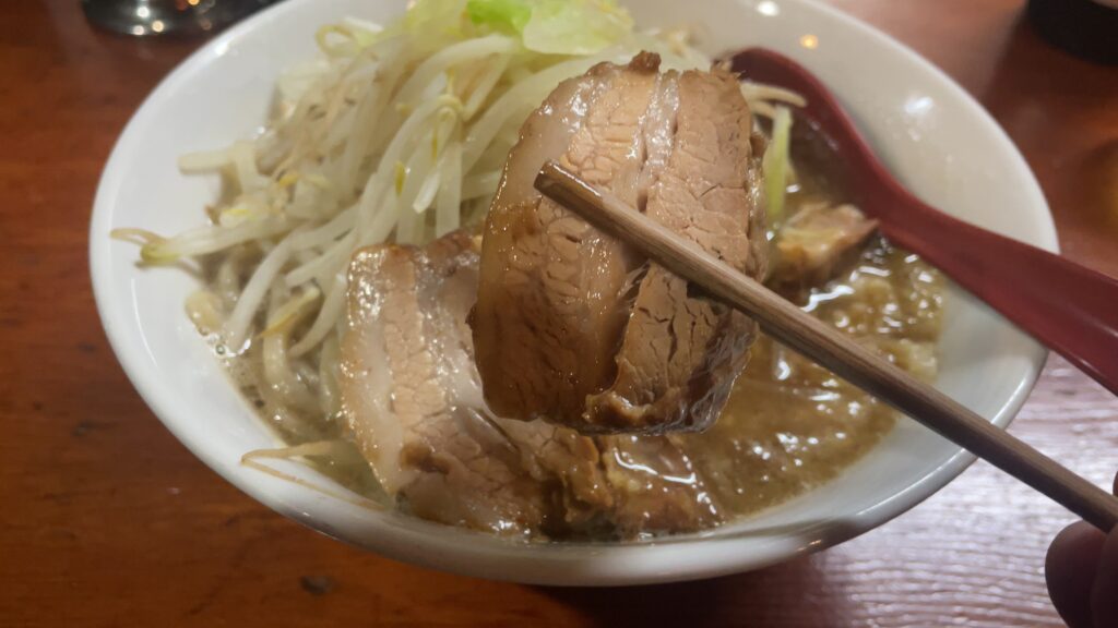 野菜は二郎系で定番のもやしが大半を占めるタイプ、たまにキャベツも入っています。このスタイルも二郎系の王道にそった感じで、期待を裏切りません。